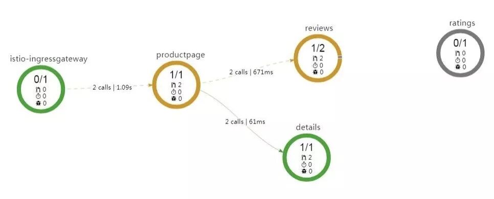 我们回到流量监控图,可以看到组件之间的访问情况。在给ratings配置了中断故障后,原本调用ratings组件的reviews组件,已经无法和ratings通信了。