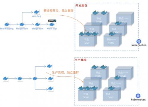 最后,按照传统的基因测序方法,单样本数据处理一般在单机上完成,所以目前普遍使用高规格机器来执行pipeline流程。但这样的话,多机并发能力就会不足,如单独开发任务调度框架,门槛成本和收益也不明显。同时单机上多任务并发能力也受限,无法很好的满载利用计算资源。但如果采用容器技术,单虚机上就可以同时运行多个Docker容器,这使得多个任务可以同时在一个VM上执行。再加上Kubernetes的资源调度能力,可以使得多任务按资源需求平均地在多VM上混合执行,这样,就会最大化利用计算资源。
