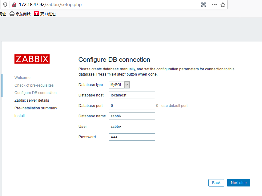 mysql> create database zabbix character set utf8 collate utf8_bin; # 创建一个数据库 mysql> grant all privileges on zabbix.* to zabbix@localhost identified by 'zabbix'; # 授权zabbix用户拥有zabbix数据库的所有权限 mysql>flush privileges; # 刷新数据库权限表 mysql> quit;