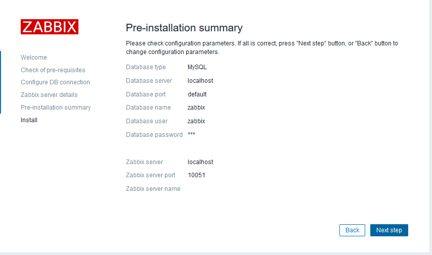 [root@node1 ~]# cat /etc/zabbix/zabbix_server.conf |grep "^DB" DBHost=localhost DBName=zabbix DBUser=zabbix DBPassword=zabbix
