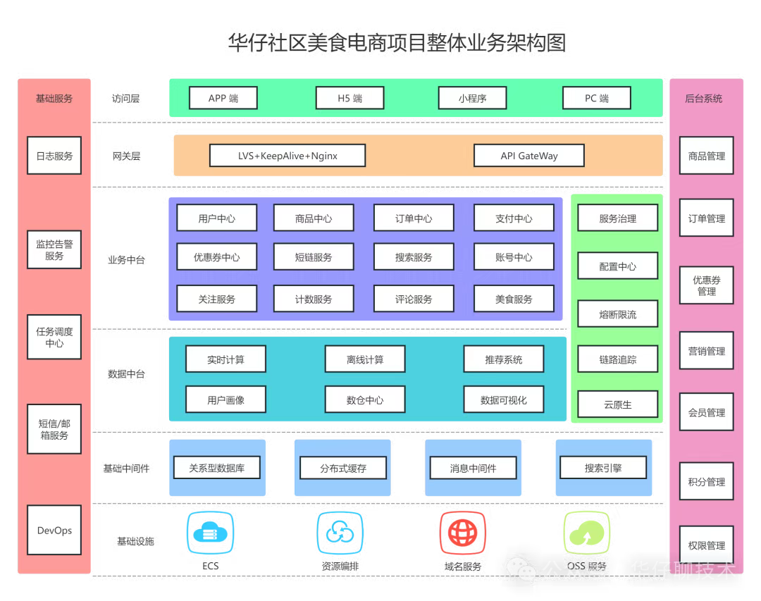 整个社区美食电商最重要的微服务模块如上图所示,新增了首页 feed 流、美食服务、关注服务、计数服务、评论服务等,该项目目标是支撑千万级流量洪峰,等第一阶段完成后,后续有时间还会新增直播服务、IM服务、秒杀服务、推荐服务、风控服务等等。1.1 业务架构这是一套非常完整且重磅级的企业级实战项目,我们先来梳理下整个社区美食电商项目的业务架构图,如下: