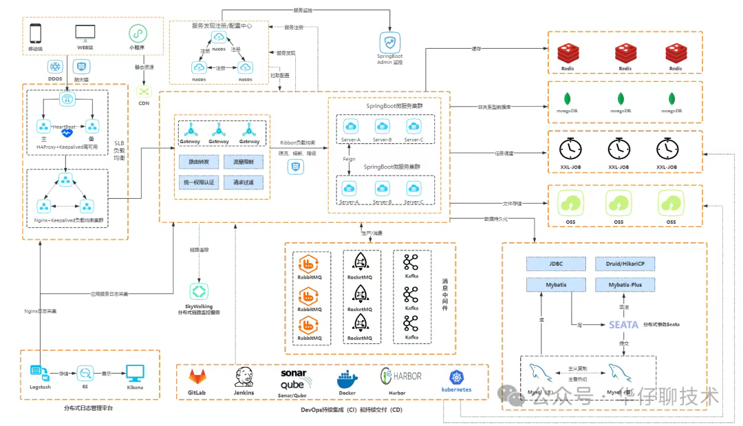 技术架构涵盖了 SpringBoot 2.6、SpringCloudAlibaba、Nacos 3.0、Sentinel、Skywalking、RocketMQ 5.x、ElasticSearch 7.9.x、Redis 7.x、MySQL 8.x、XXL-Job、Redisson 等技术: