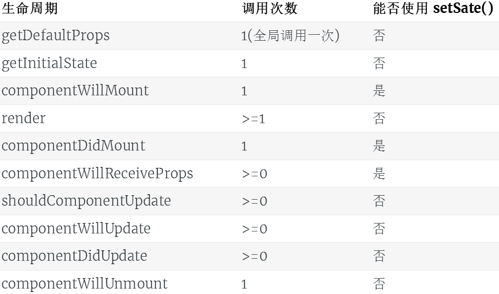- getInitialState:初始化组件的状态。返回值将会作为 this.state 的初始值。