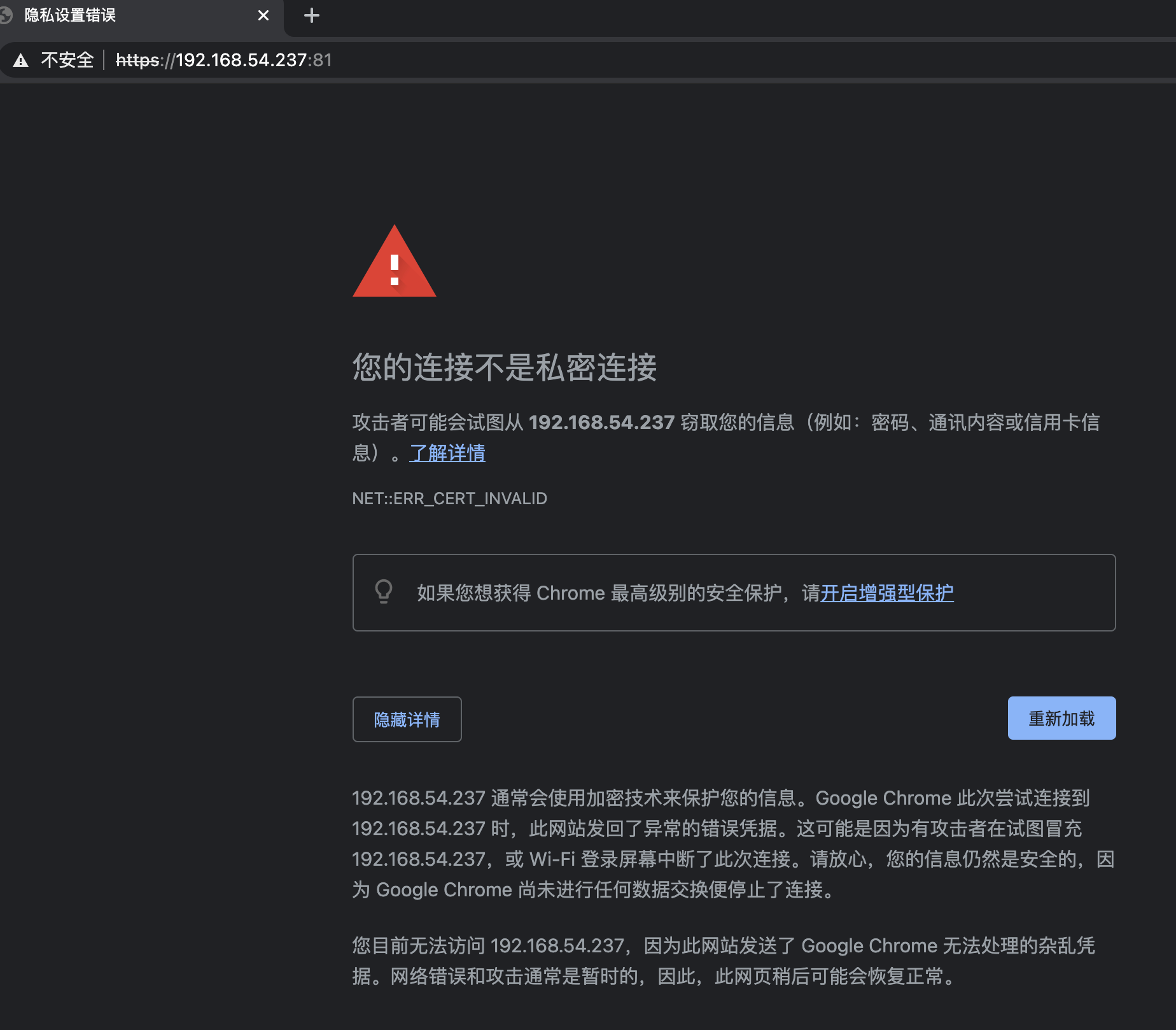 在碰到局域网内https://192.168.54.237:81页面时,提示您的连接不是安全连接,