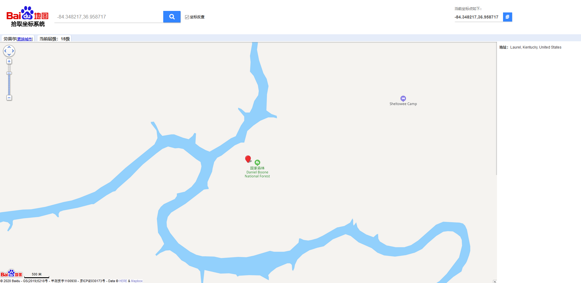 GPS定位地址:36 deg 57' 31.38" N, 84 deg 20' 53.58" W,