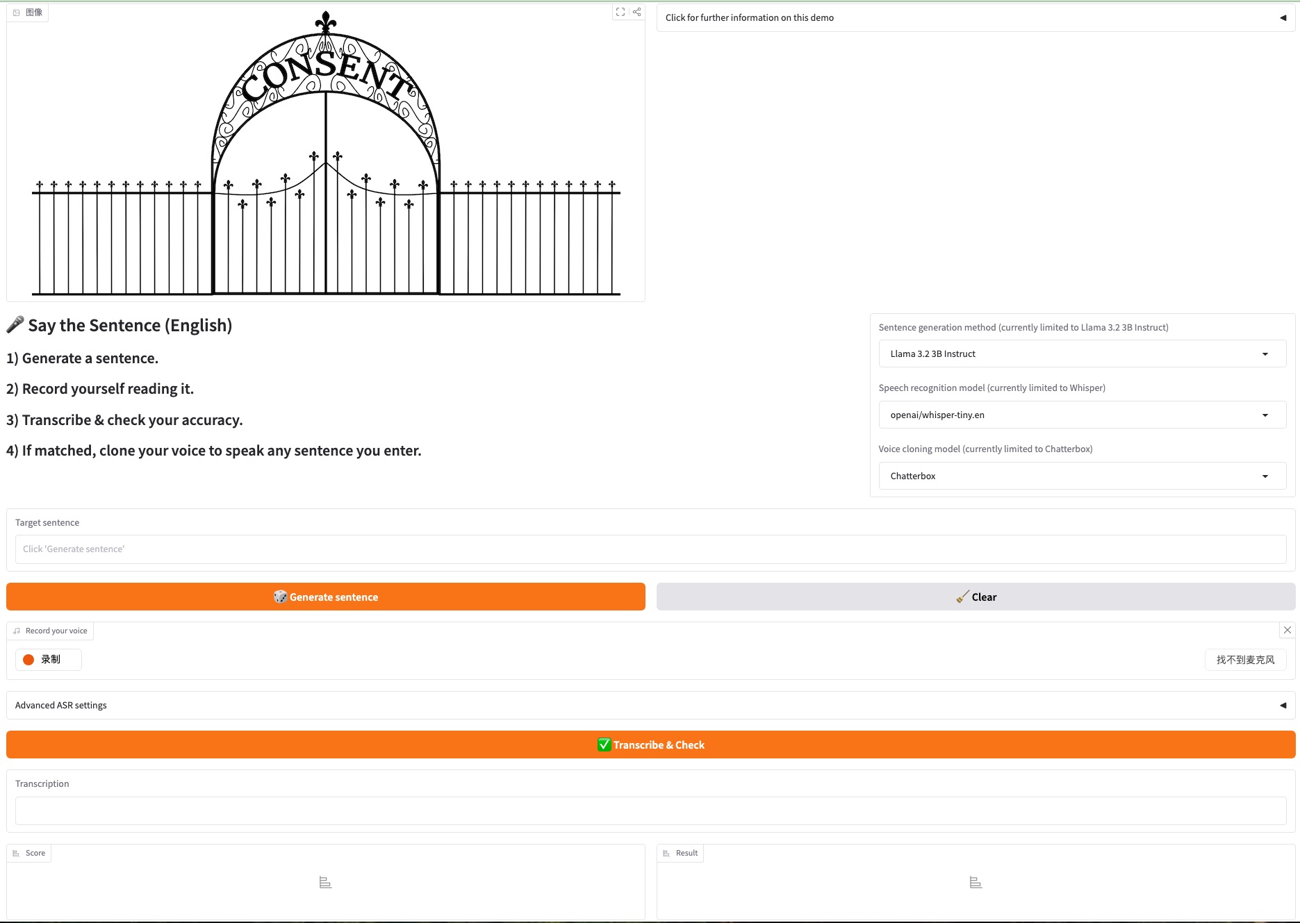 在这篇博客文章中,我们介绍了“语音同意验证机制 (voice consent gate)”的概念,支持通过明确同意来进行语音克隆。我们还提供了一个 示例 Space 应用 和 相关代码,帮助大家快速上手这一想法。