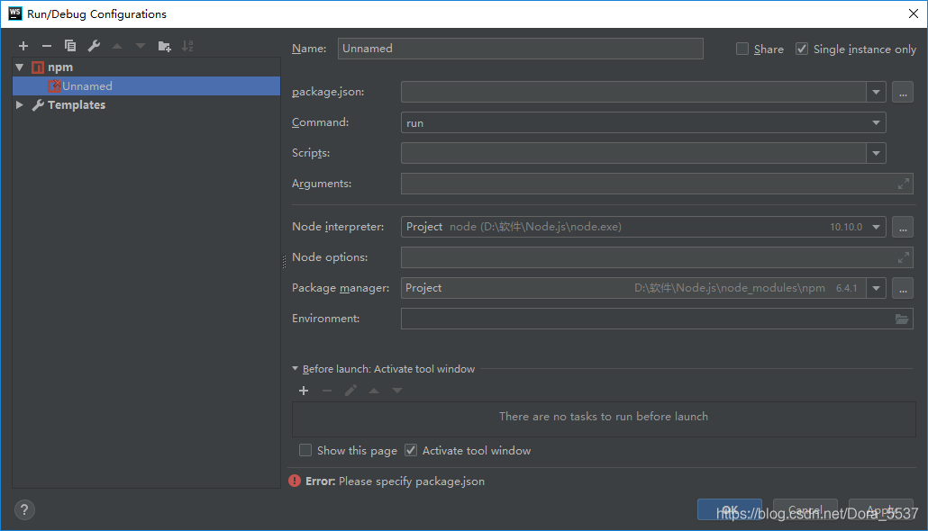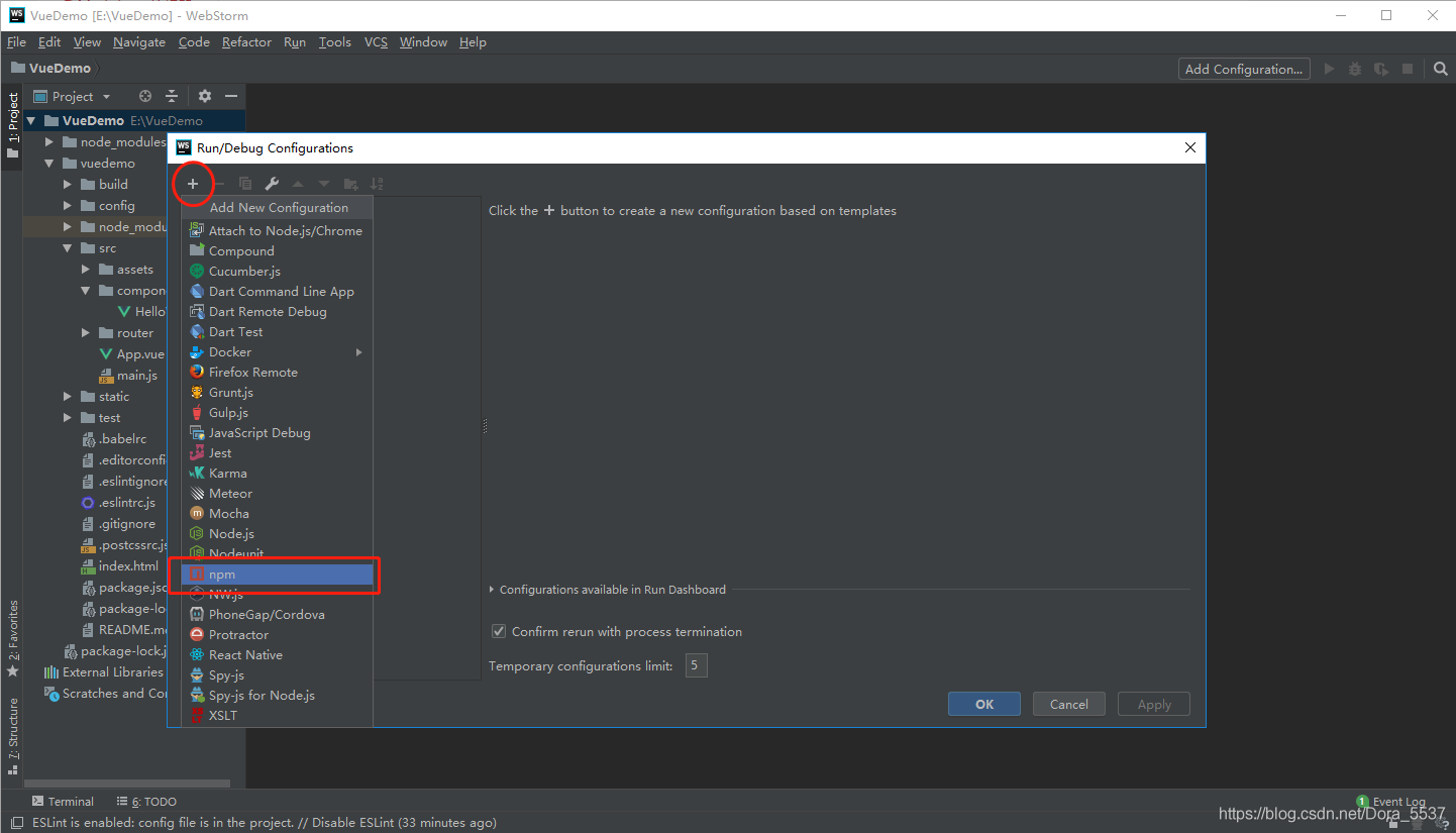 2.在出现的弹框中选中左上角“+”下的“npm”,如下图所示。