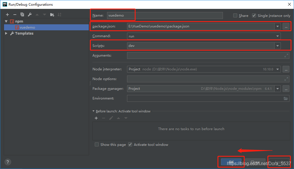 Scripts——点击右边的下拉箭头,选中"dev"。