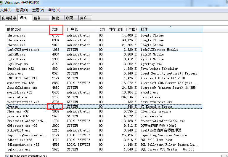 4. 在任务管理器中的进程处查看与上述80端口对应的PID相同的进程,并关闭。如果没有PID,选择“查看”-->"选择列"-->勾选“PID”。