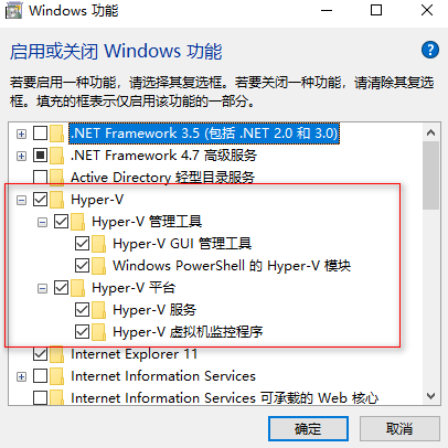 然后再是进入电脑的控制面板->程序->启用或关闭Windows功能->把Hyper-v勾上,启用后电脑会重启,后面就可以下载并安装Docker for Windows了。