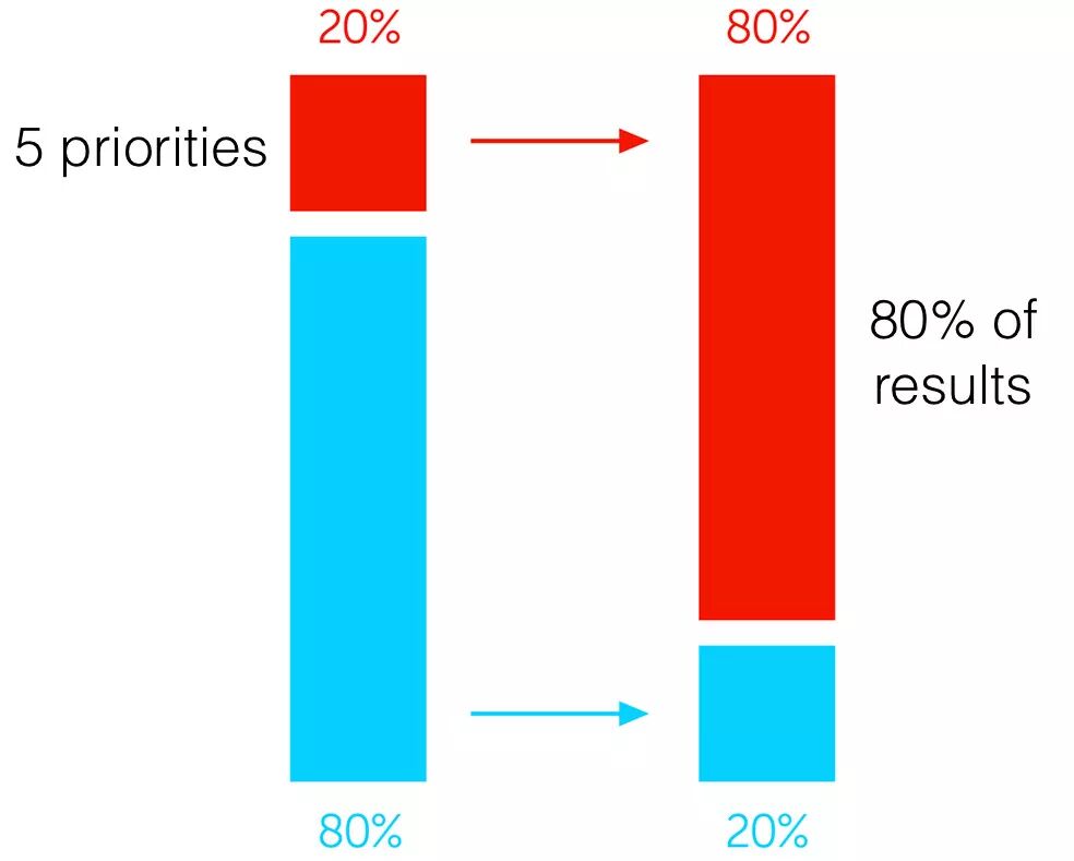 所以,如果你把25个优先事项的清单缩小到5个优先事项,你就可以再次运用80/20规则,把注意力集中在一个优先事项上,这个优先事项给了你这5个优先事项80%的结果。