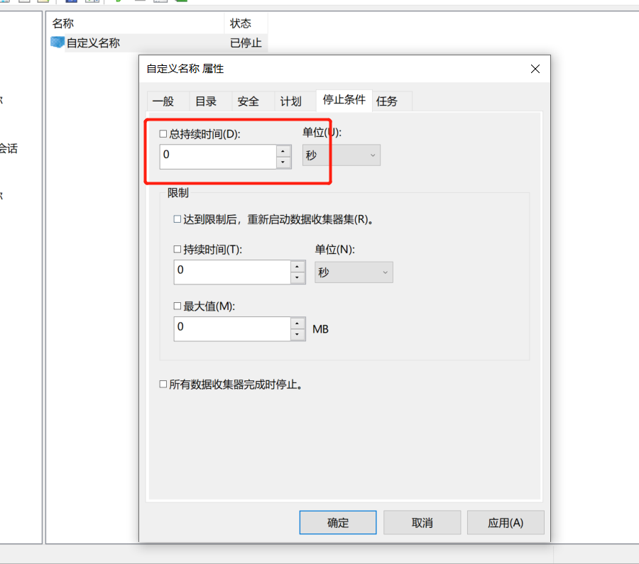 6.点击属性中的停止条件可以设置监控的固定时间