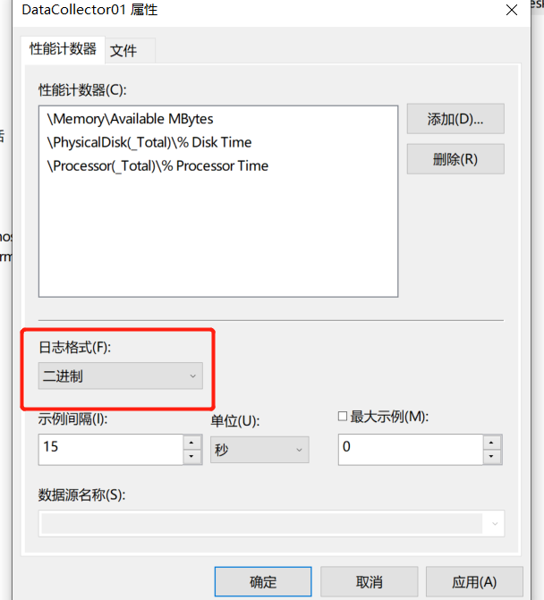 7.右击性能计数器属性可以选择日志格式,一般选择二进制格式