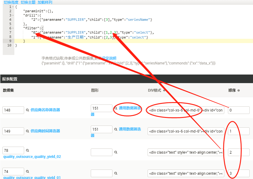 { "paraminit":{}, "filter":{ "0":{"paramname":"SUPPLIER","child":[1,2,3]}, "1":{"paramname":"生产日期","child":[2,3]} } } //设定说明 关于filter的设定和drill类似, 你只需要设定你的筛选器所在的"顺序号" 如 0, 然后设置 它绑定的参数名称paramname, 如SUPPLIER, 然后child,对应的是这个筛选器联动的图形序号,如选择0号筛选器时, 如需要1(筛选器),2(图形)3(图形), 联动时, 只用设置[1,2,3] //关于筛器的位置 这是和图形摆放一样的, 有一个小窍门就是, 当你用通用模板时, 当你需要筛选器并排展示, 那么, 你可以如下图中 DIV格式中, 增加一个DIV : <div class="col-xs-6 col-md-6">....</div>