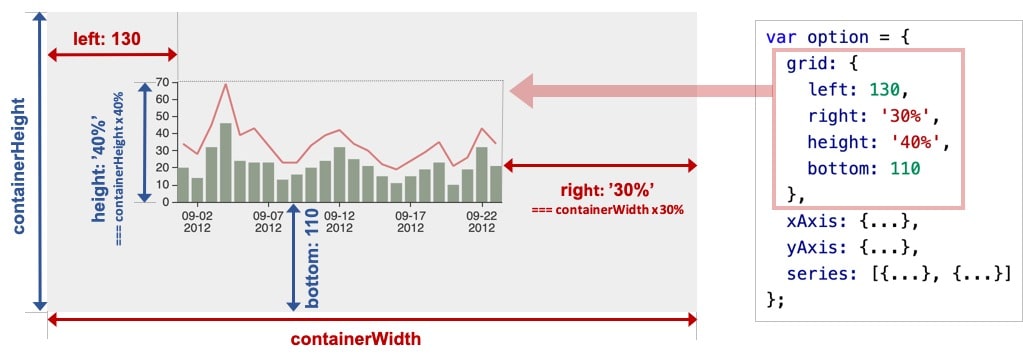 绝对数值(例如 bottom: 54 表示:距离 echarts 容器底边界 54 像素)。 或者基于 echarts 容器高宽的百分比(例如 right: '20%' 表示:距离 echarts 容器右边界的距离是 echarts 容器宽度的 20%)。 如下图的例子,对 grid 组件(也就是直角坐标系的底板)设置 left、right、height、bottom 达到的效果。