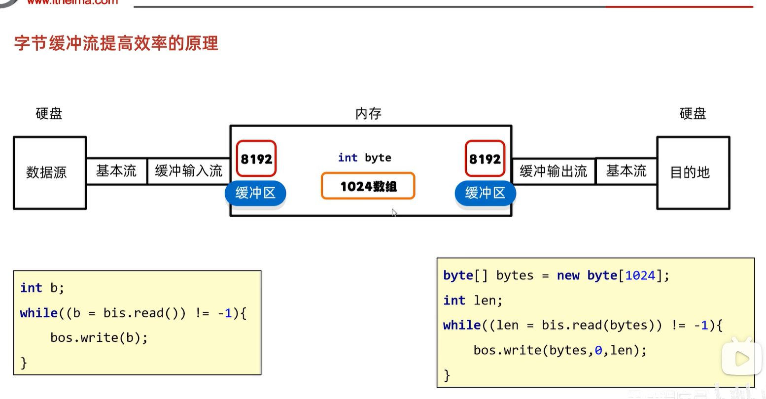 上面是一次传输一个数组的传输方法,实际上就是传输时在内存中创建输入和输出流的缓冲区,并用硬盘的数据尽可能装满输入流缓冲区,并用数组/字节类型进行传递至输出流的缓冲区