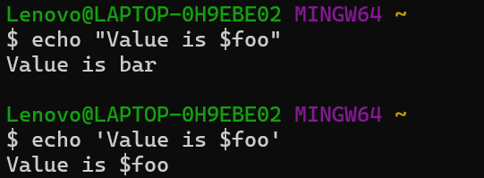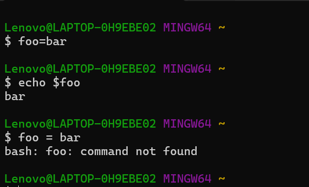 - shell可以被用来给变量赋值,注意不能在=的左右两端加空格,因为空格是分割参数的字符,如果像第三个那样去写,它会将=和bar作为两个参数传入foo,而foo不是一个有效程序,就会报找不到程序的错误
