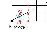 在画直线的过程中,当前像素点P(xp,yp),则下一个点与直线最接近的像素只能是P1或者P2,即P点的正右方或者右上角的点。设M(xp+1,yp+0.5)为P1与P2的中点,Q为与理想直线与x=xp+1线相交的点。当M在Q的下方时,则P2应为下一像素点;当M在Q的上方时,则P1应为下一像素点。
