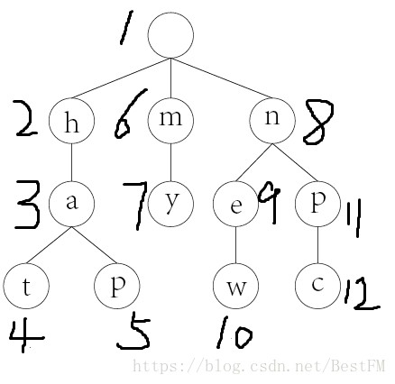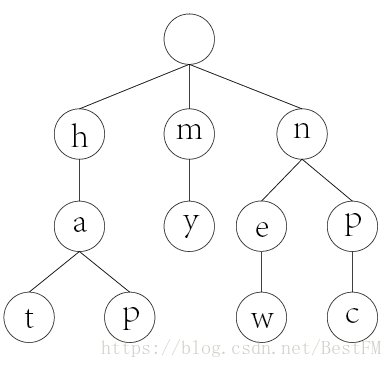 下图是对单词hat、hap、my、new、npc建立的一个字典树