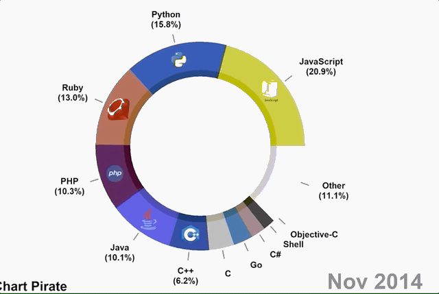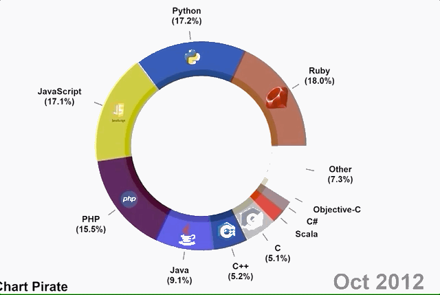 从2012年到2013年,前三个席位还是Puby,Python和JavaScript。而Python也一度占据了 18.1% 。
