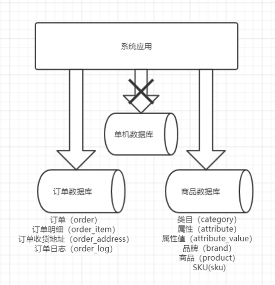 一个架构设计较好的应用系统,其总体功能肯定是有多个不同的功能模块组成的。每一个功能模块对应着数据库里的一系列表。例如在B2B当中,商品功能模块对应的表包括:类目、属性、属性值、品牌、商品、sku等表。而在订单模块中,对应的表包括:订单、订单明细、订单收货地址、订单日志等。如图所示: