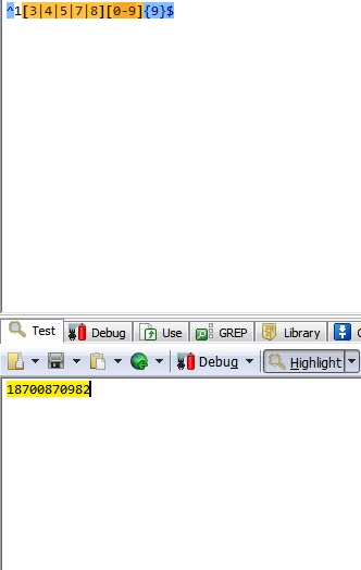 3.验证手机号码:"^1[3|4|5|7|8][0-9]{9}$";