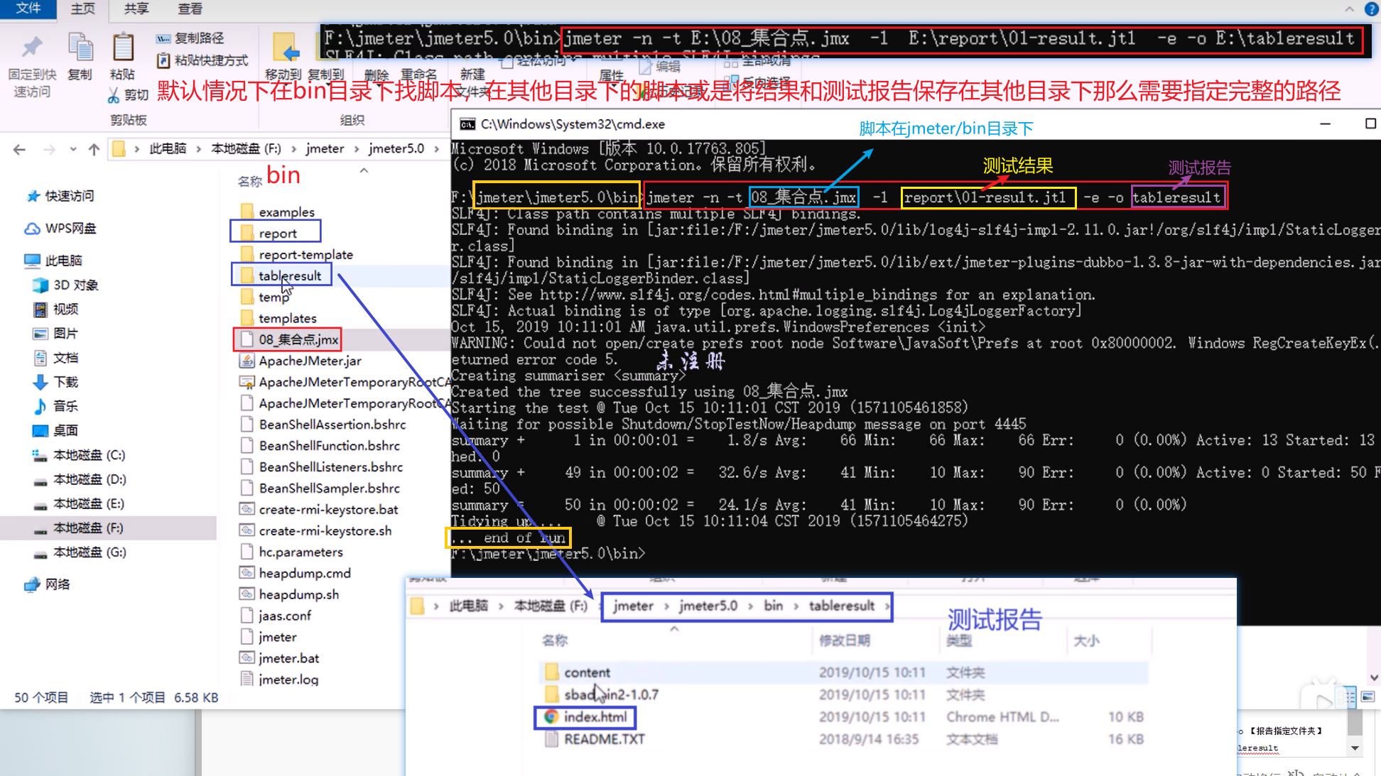 tips:默认目录是jmeter下的bin,如果要用其他目录下的脚本或者是将结果和测试报告保存到其他目录下那么需要指定完整的路径。
