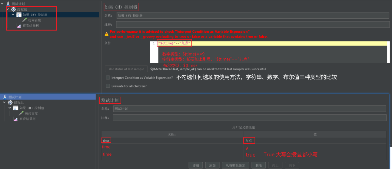 不勾选将条件解释为变量表达式:【在线程组上右键-添加-逻辑控制器-如果(if)控制器-->在如果(if)控制器里加http请求,在线程组上右键添加察看结果树】