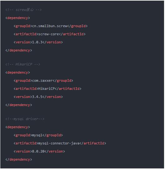引入screw核心包,HikariCP数据库连接池,HikariCP号称性能最出色的数据库连接池。