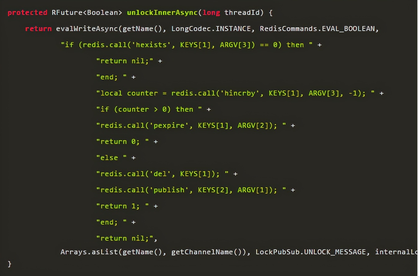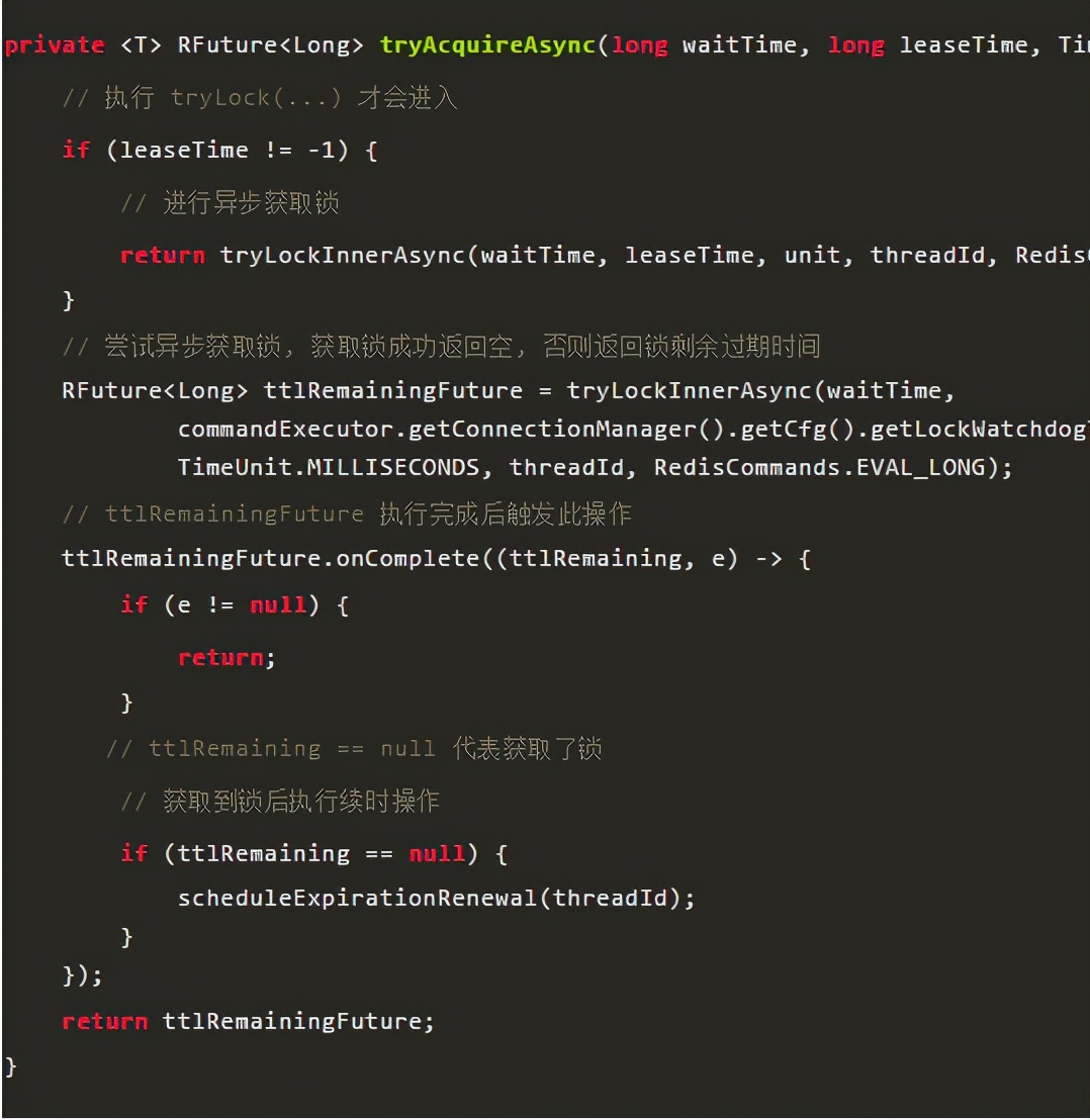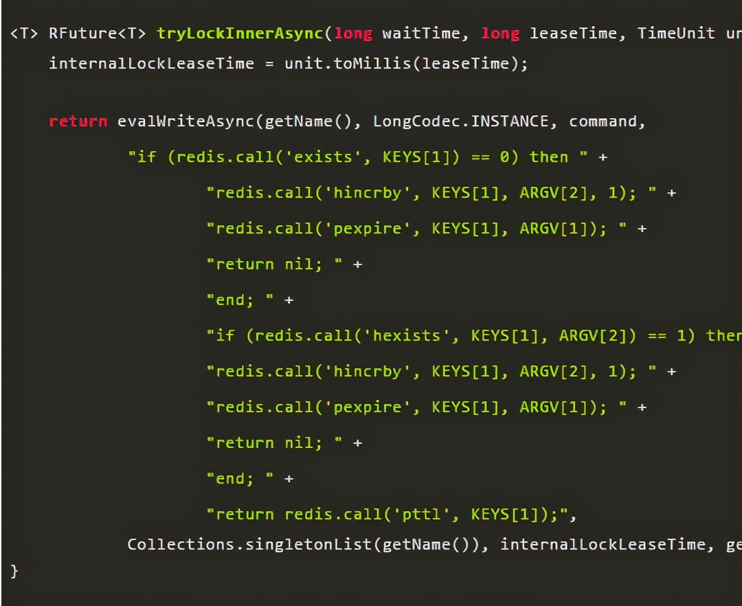 继续看一下 tryLockInnerAsync(...) 详细的加锁流程, 内部采用的 Lua 脚本形式, 保证了原子性操作