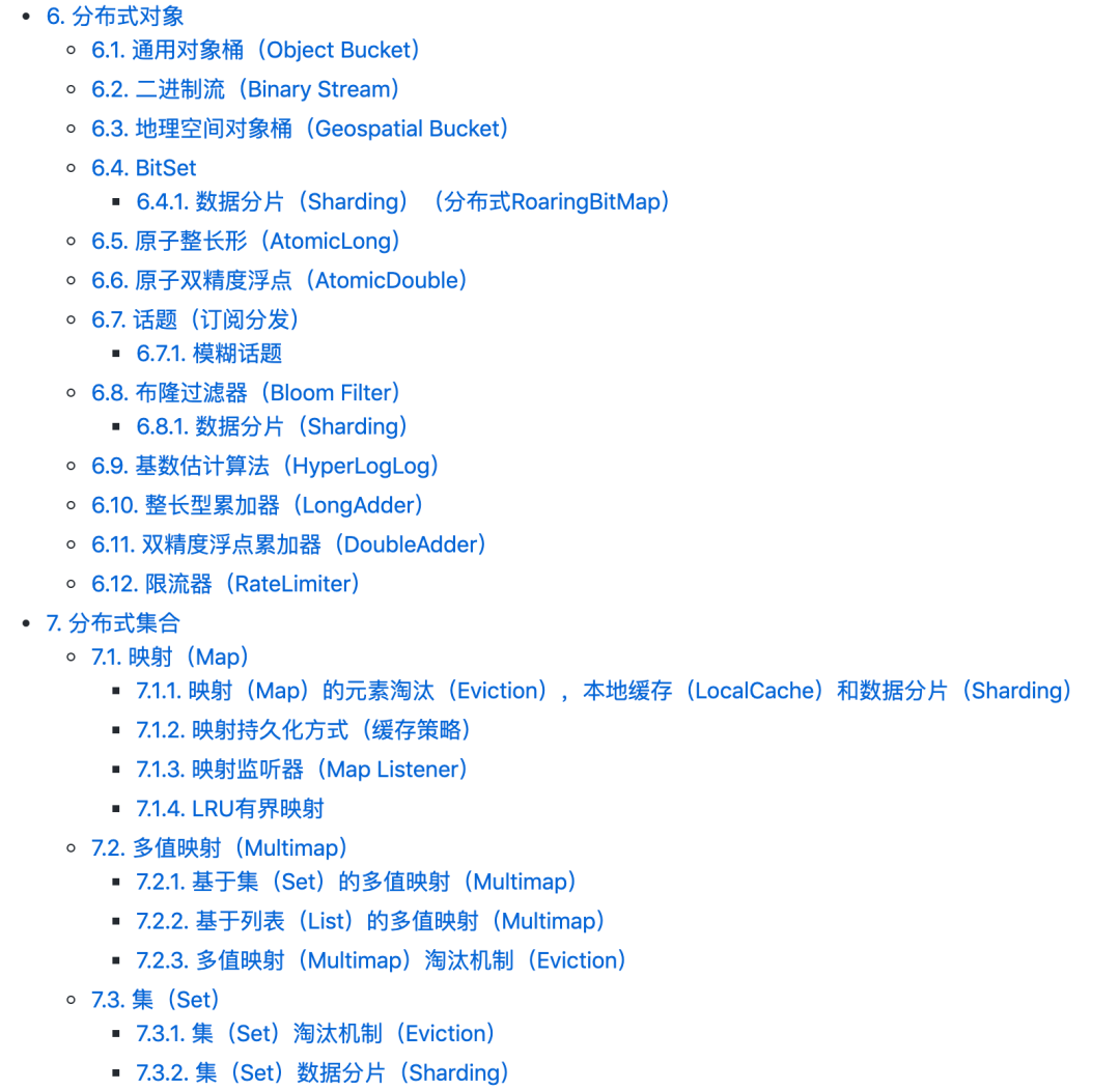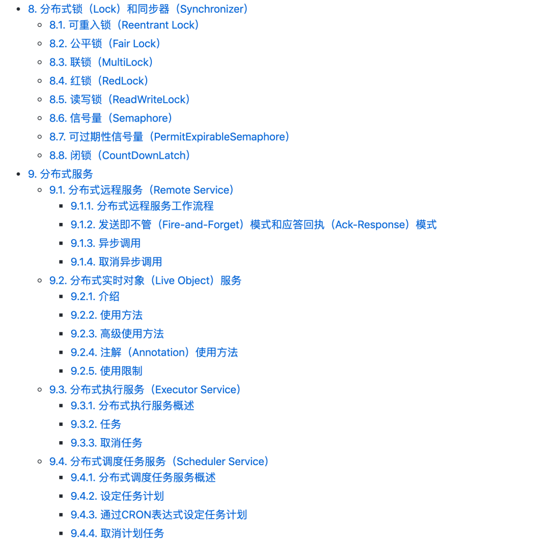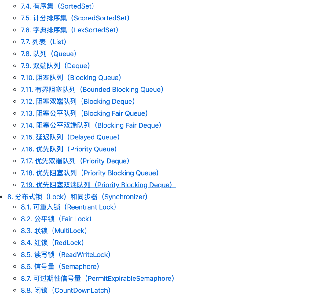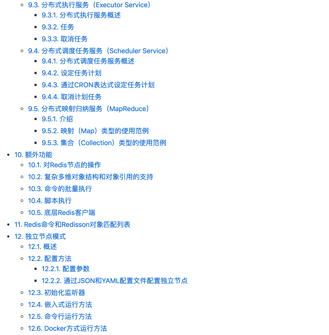 可以直接查看 Github Redisson官网 介绍, 没有了解过的小伙伴, 看一下 Redisson 的 WIKI 目录, 仔细瞅瞅 Redis 是如何被 Redisson 武装到牙齿的