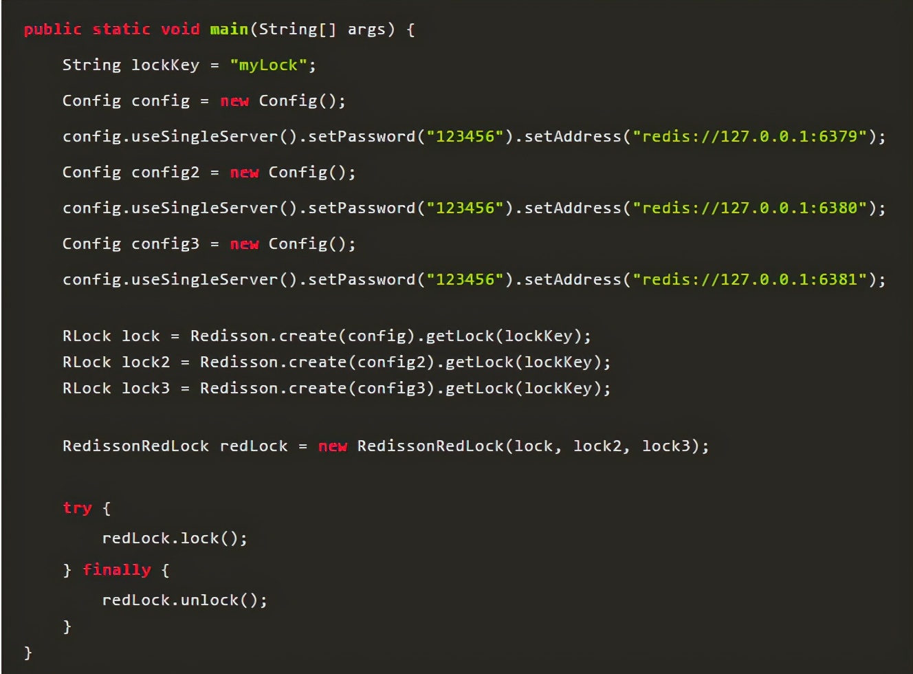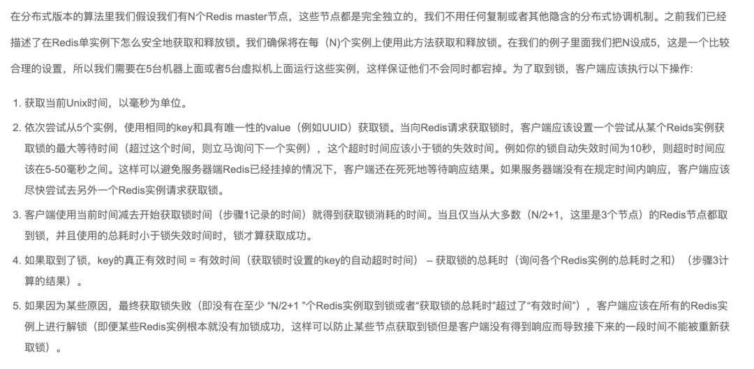 所以 Redis 作者 Antirez 推出 红锁算法, 这个算法的精髓就是: 没有从节点, 如果部署多台 Redis, 各实例之间相互独立, 不存在主从复制或者其他集群协调机制