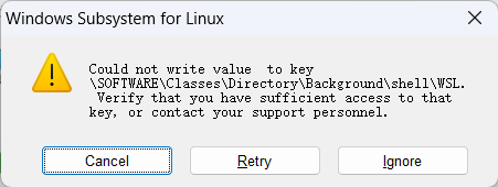 Could not write value to key SFTWARE\ClassesDirectory\Background\shell\WSL...