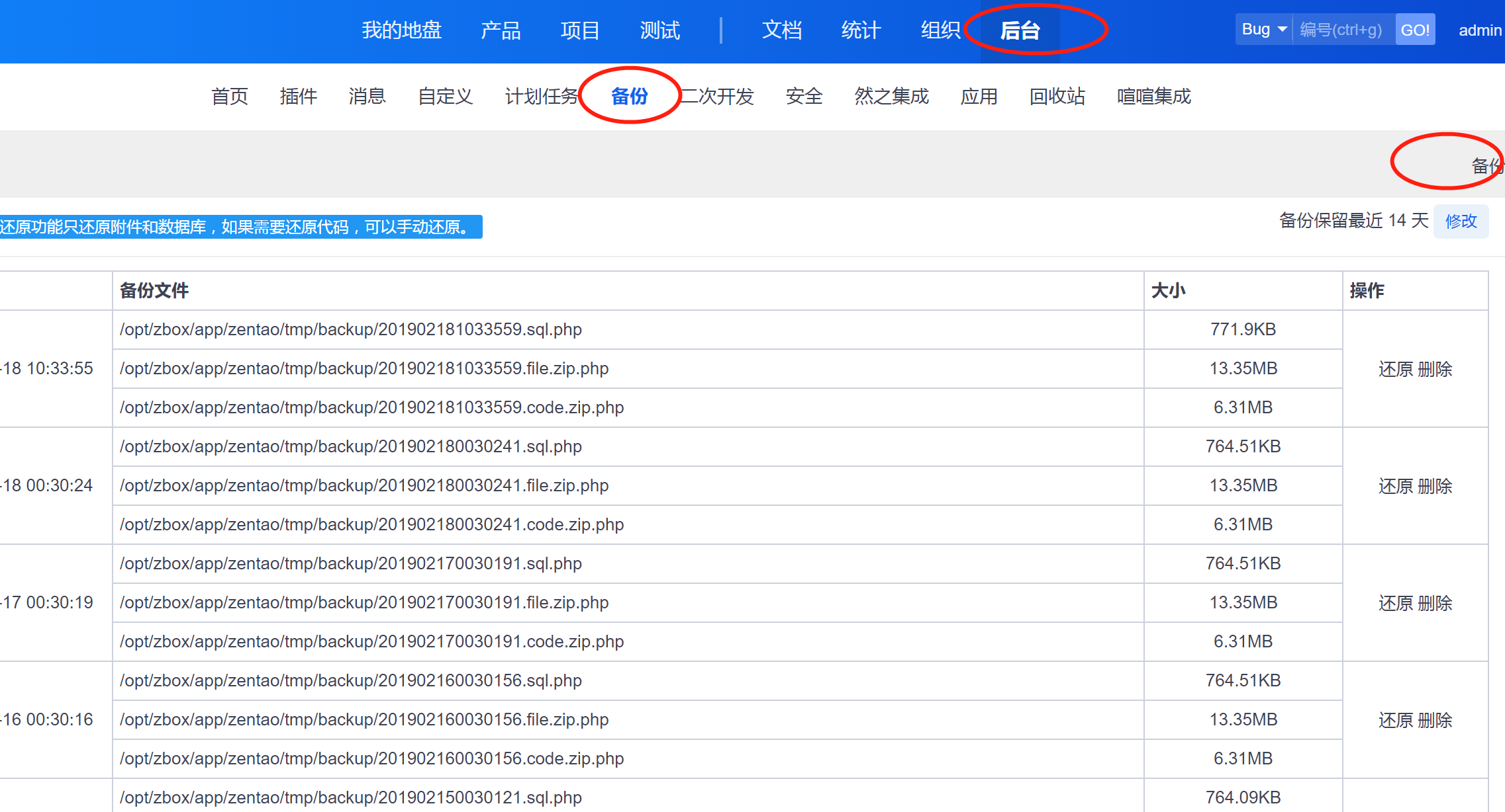 可以通用用上面的方式看看有没有历史备份文件夹,目录是zentao下的tmp/backup