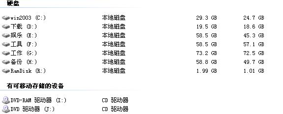 还有,用RAMDisk这个小软件,就可用把内存虚拟成硬盘来使用,速度飞快,下面的图就是虚拟的硬盘,嘻嘻,有2G哦。