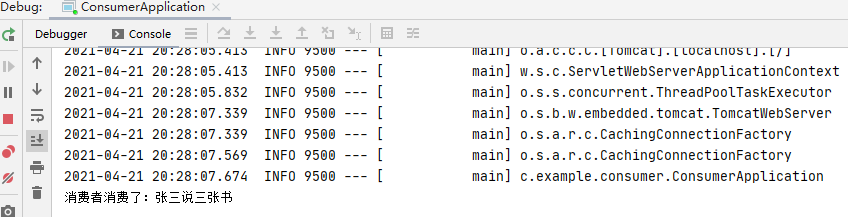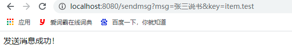 启动程序,访问http://localhost:8080/sendmsg?msg=%E5%BC%A0%E4%B8%89%E8%AF%B4%E4%B9%A6&key=item.test