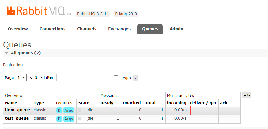 说明消息成功发送到RabbitMQ的队列中了。接下来实现消费就可读取队列中的消息了。