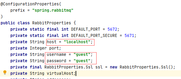 这些配置是默认的,不需要配置,除非你新建了自己的用户。通过从查看源码的角度我们就可以找到答案。一般来说在applicationd的配置文件中的参数,可以找到对应的XXProperties.class文件,如rabbitmq对应的就是RabbitProperties.class文件,打开如下图所示: