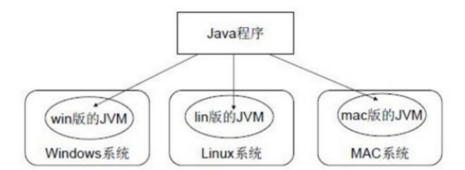 如图所示,Java的虚拟机本身不具备跨平台功能的,每个操作系统下都有不同版本的虚拟机。