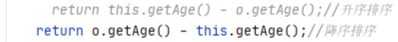public class Person01 implements Comparable<Person01> { private String name; private int age; public Person01() { } public Person01(String name, int age) { this.name = name; this.age = age; } @Override public String toString() { return "Person01{" + "name='" + name + '\'' + ", age=" + age + '}'; } public String getName() { return name; } public void setName(String name) { this.name = name; } public int getAge() { return age; } public void setAge(int age) { this.age = age; } //重写排序规则 @Override public int compareTo(Person01 o) { // return 0; //默认的返回值 //自定义一个默认排序 // return this.getAge() - o.getAge();//升序排序 return o.getAge() - this.getAge();//降序排序 } }