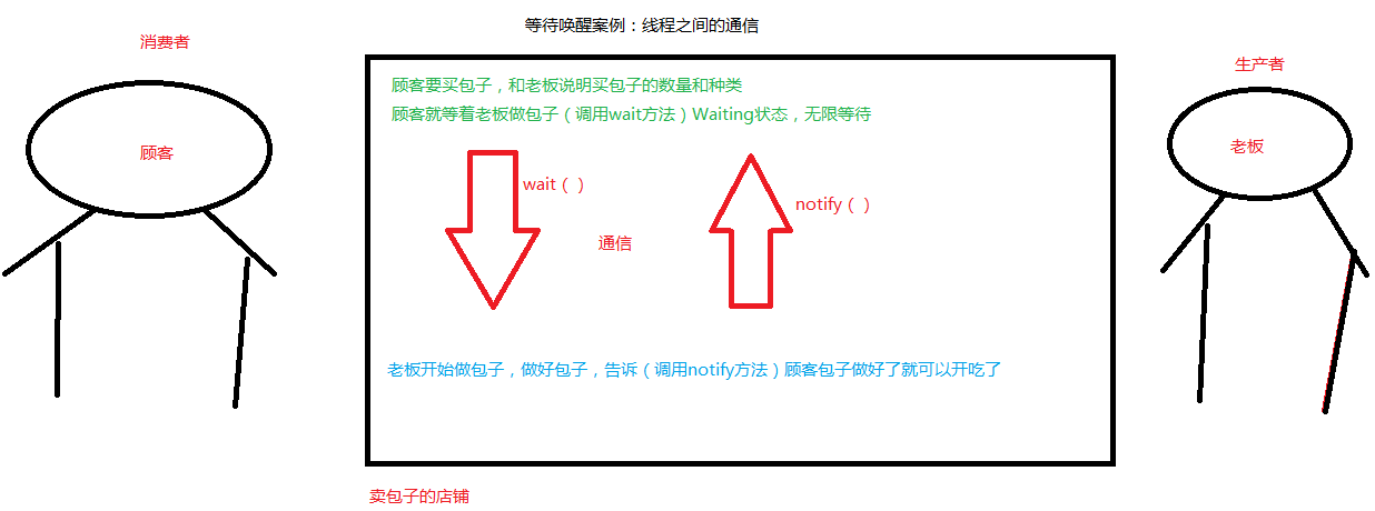 创建一个老板线程(生产者):花了5秒做包子,做好包子之后,调用notify方法,唤醒顾客吃包子