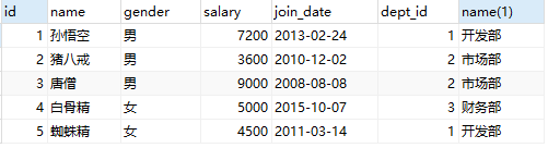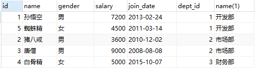 SELECT emp.*,dept.`name` FROM emp LEFT JOIN dept ON emp.dept_id = dept.id;