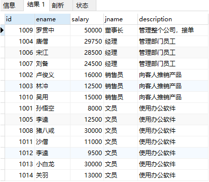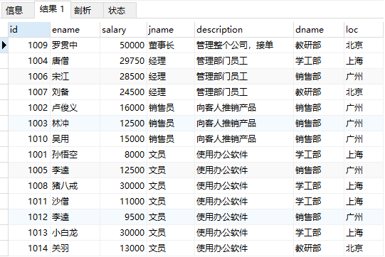 -- 1. 查询所有员工信息。查询员工编号,员工姓名,工资,职务名称,职务描述