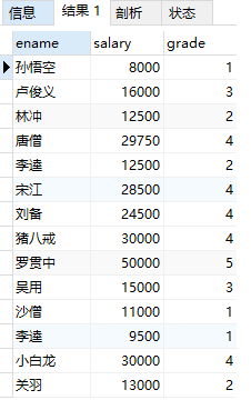 /* 分析: 1.员工姓名,工资 emp表; 工资等级 salarygrade 2.条件emp.salary >= salarygrade.losalary and emp.salary <= salarygrade.hisalary and emp.salary = salarygrade */ select t1.ename,t1.salary,t2.grade from emp t1,salarygrade t2 where t1.salary between t2.losalary and t2.hisalary;