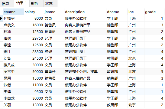 /* 分析: 1.员工姓名,工资 emp; 职务名称,职务描述 job; 部门名称,部门位置,dept; 工资等级salarygrade; 2.条件 emp.job_id = job.id and emp.dept_id = dept.id and emp.salary between salarygrade.losalary and salarygrade.hisalary */ select t1.ename,t1.salary,t2.jname,t2.description,t3.dname,t3.loc,t4.grade from emp t1,job t2,dept t3,salarygrade t4 where t1.job_id = t2.id and t1.dept_id = t3.id and t1.salary BETWEEN t4.losalary and t4.hisalary;