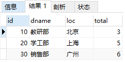 /* 分析: 1.部门编号、部门名称、部门位置 dept表; 部门人数 emp表; 2.使用分组查询。按照emp.dept_id完成分组,查询count(id) 3.使用子查询将第二部的查询结果和dept表进行关联查询 */ select t1.id,t1.dname,t1.loc,t2.total from dept t1,(select dept_id,count(id) total from emp GROUP BY dept_id) t2 where t1.id = t2.dept_id;