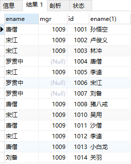 /* 分析: 1.姓名emp,直接上级的姓名emp;emp表的id和mgr是自关联 2.条件emp.id = emp.mgr */ select t1.ename, t1.mgr, t2.id ,t2.ename from emp t1,emp t2 where t1.id = t2.mgr;