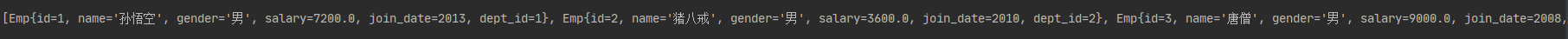 public class Emp { private int id; private String name; private String gender; private double salary; private long join_date; private int dept_id; public int getId() { return id; } public void setId(int id) { this.id = id; } public String getName() { return name; } public void setName(String name) { this.name = name; } public String getGender() { return gender; } public void setGender(String gender) { this.gender = gender; } public double getSalary() { return salary; } public void setSalary(double salary) { this.salary = salary; } public long getJoin_date() { return join_date; } public void setJoin_date(long join_date) { this.join_date = join_date; } public int getDept_id() { return dept_id; } public void setDept_id(int dept_id) { this.dept_id = dept_id; } @Override public String toString() { return "Emp{" + "id=" + id + ", name='" + name + '\'' + ", gender='" + gender + '\'' + ", salary=" + salary + ", join_date=" + join_date + ", dept_id=" + dept_id + '}'; } }