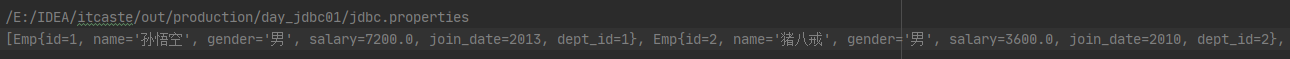 public static void main(String[] args) { List<Emp> list = new JDBCDemo8().findAll1(); System.out.println(list); } public List<Emp> findAll1() { List<Emp> list = null; ResultSet res = null; Statement sta = null; Connection conn = null; try { // // 1.注册驱动成功 // Class.forName("com.mysql.jdbc.Driver"); // // 2.数据库连接 // conn = DriverManager.getConnection("jdbc:mysql:///mybatis", "root", "root"); conn = JDBCUtils.getConnection(); // 3.指定sql语句 String sql = "select * from emp"; // 4.获取sql对象语句 sta = conn.createStatement(); // 5.执行sql res = sta.executeQuery(sql); // 6.遍历结果集,封装对象,装载集合 Emp emp = null; list = new ArrayList<>(); while (res.next()) { // 获取数据 int id = res.getInt("id"); String name = res.getString("name"); String gender = res.getString("gender"); double salary = res.getDouble("salary"); long join_date = res.getLong("join_date"); int dept_id = res.getInt("dept_id"); // 创建emp对象 emp = new Emp(); emp.setId(id); emp.setName(name); emp.setGender(gender); emp.setSalary(salary); emp.setJoin_date(join_date); emp.setDept_id(dept_id); //装载集合 list.add(emp); } } catch (SQLException es) { es.printStackTrace(); } finally { // // 7.释放资源 // // 避免空指针异常 // if (conn != null) { // try { // conn.close(); // } catch (SQLException e) { // e.printStackTrace(); // } // } // } // // 7.释放资源 // // 避免空指针异常 // if (sta != null) { // try { // sta.close(); // } catch (SQLException e) { // e.printStackTrace(); // } // } // // 7.释放资源 // // 避免空指针异常 // if (res != null) { // try { // res.close(); // } catch (SQLException e) { // e.printStackTrace(); // } JDBCUtils.close(sta,conn,res); } return list; }