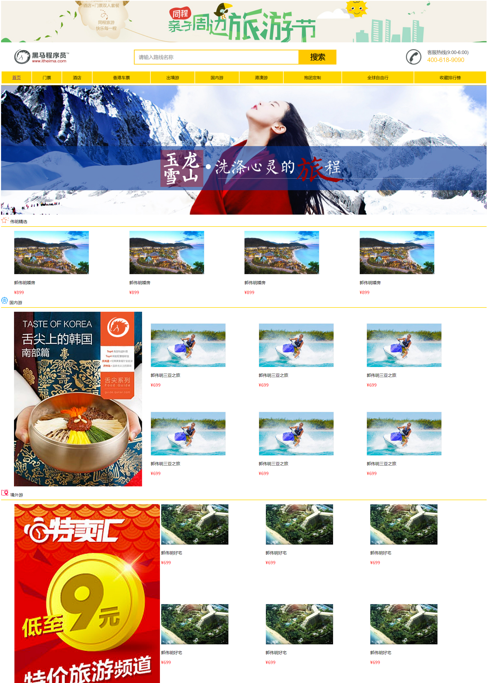 <!DOCTYPE html> <html lang="en"> <head> <meta charset="UTF-8"> <title>旅游网页</title> </head> <body> <!--采用table来完成布局--> <!--最外层的table,用于整个页面的布局--> <table width="100%" align="center"> <!--第1行--> <tr> <td> <img src="../img/tope.jpg" width="100%"> </td> </tr> <!--第2行--> <tr> <td> <table width="100%" align="center"><!--嵌套表格--> <tr align="center"><!--align:对齐方式--> <td> <img src="../img/logo.jpg" alt=""> </td> <td> <img src="../img/search.png" alt=""> </td> <td> <img src="../img/hotel.png" alt=""> </td> </tr> </table> </td> </tr> <!--第3行--> <tr> <td> <table width="100%" align="center"><!--嵌套表格--> <tr bgcolor="#ffd700" align="center" height="45"><!--bgcolor:颜色 align:对齐方式 height:高度--> <td> <a href="">首页</a> </td> <td> 门票 </td> <td> 酒店 </td> <td> 香港车票 </td> <td> 出境游 </td> <td> 国内游 </td> <td> 港澳游 </td> <td> 抱团定制 </td> <td> 全球自由行 </td> <td> 收藏排行榜 </td> </tr> </table> </td> </tr> <!--第4行--> <tr> <td> <img src="../img/banner.jpg" alt="" width="100%"> </td> </tr> <!--第6行--> <tr> <td> <img src="../img/icon.jpg" alt="" > 伟明精选 <hr color="ffd700" > </td> </tr> <!-- 第6行--> <tr> <td> <table width="95%" align="center"> <tr> <td> <img src="../img/jianxuan.jpg"> <p>郭伟明婚房</p> <font color="red">¥899</font> </td> <td> <img src="../img/jianxuan.jpg"> <p>郭伟明婚房</p> <font color="red">¥899</font> </td> <td> <img src="../img/jianxuan.jpg"> <p>郭伟明婚房</p> <font color="red">¥899</font> </td> <td> <img src="../img/jianxuan.jpg"> <p>郭伟明婚房</p> <font color="red">¥899</font> </td> </tr> </table> </td> </tr> <!--第7行--> <tr> <td> <img src="../img/iconk.jpg" alt=""> 国内游 <hr color="ffd700"> </td> </tr> <!--第8行--> <tr> <td> <table width="95%" align="center"> <tr> <td rowspan="2"> <img src="../img/guone.jpg" alt="" width="95%"> </td> <td> <img src="../img/jian.jpg" height="100%"> <p>郭伟明三亚之旅</p> <font color="red">¥699</font> </td> <td> <img src="../img/jian.jpg"> <p>郭伟明三亚之旅</p> <font color="red">¥699</font> </td> <td> <img src="../img/jian.jpg"> <p>郭伟明三亚之旅</p> <font color="red">¥699</font> </td> </tr> <tr> <td> <img src="../img/jian.jpg"> <p>郭伟明三亚之旅</p> <font color="red">¥699</font> </td> <td> <img src="../img/jian.jpg"> <p>郭伟明三亚之旅</p> <font color="red">¥699</font> </td> <td> <img src="../img/jian.jpg"> <p>郭伟明三亚之旅</p> <font color="red">¥699</font> </td> </tr> </table> </td> </tr> <!--第9行--> <tr> <td> <img src="../img/iconm.jpg"> 境外游 <hr color="ffd700"> </td> </tr> <!--第10行--> <tr> <td> <table width="95%" align="center"> <tr> <td rowspan="2"> <img src="../img/jiang.jpg" width="100%"> </td> <td> <img src="../img/xuan.jpg" height="100%"> <p>郭伟明好宅</p> <font color="red">¥699</font> </td> <td> <img src="../img/xuan.jpg"> <p>郭伟明好宅</p> <font color="red">¥699</font> </td> <td> <img src="../img/xuan.jpg"> <p>郭伟明好宅</p> <font color="red">¥699</font> </td> </tr> <tr> <td> <img src="../img/xuan.jpg"> <p>郭伟明好宅</p> <font color="red">¥699</font> </td> <td> <img src="../img/xuan.jpg"> <p>郭伟明好宅</p> <font color="red">¥699</font> </td> <td rowspan="2"> <img src="../img/xuan.jpg"> <p>郭伟明好宅</p> <font color="red">¥699</font> </td> </tr> </table> </td> </tr> <!--第11行--> <tr> <td> <img src="../img/service.jpg" width="100%"> </td> </tr> <!--第12行--> <tr> <td bgcolor="#ffd700" align="center" height="40"> <font color="gray"> 四川未央老王教育科技股份有限公司 版权所有Copyright 2006-2018©, All Rights Reserved 川ICP备16007882 </font> </td> </tr> </table> </body> </html>